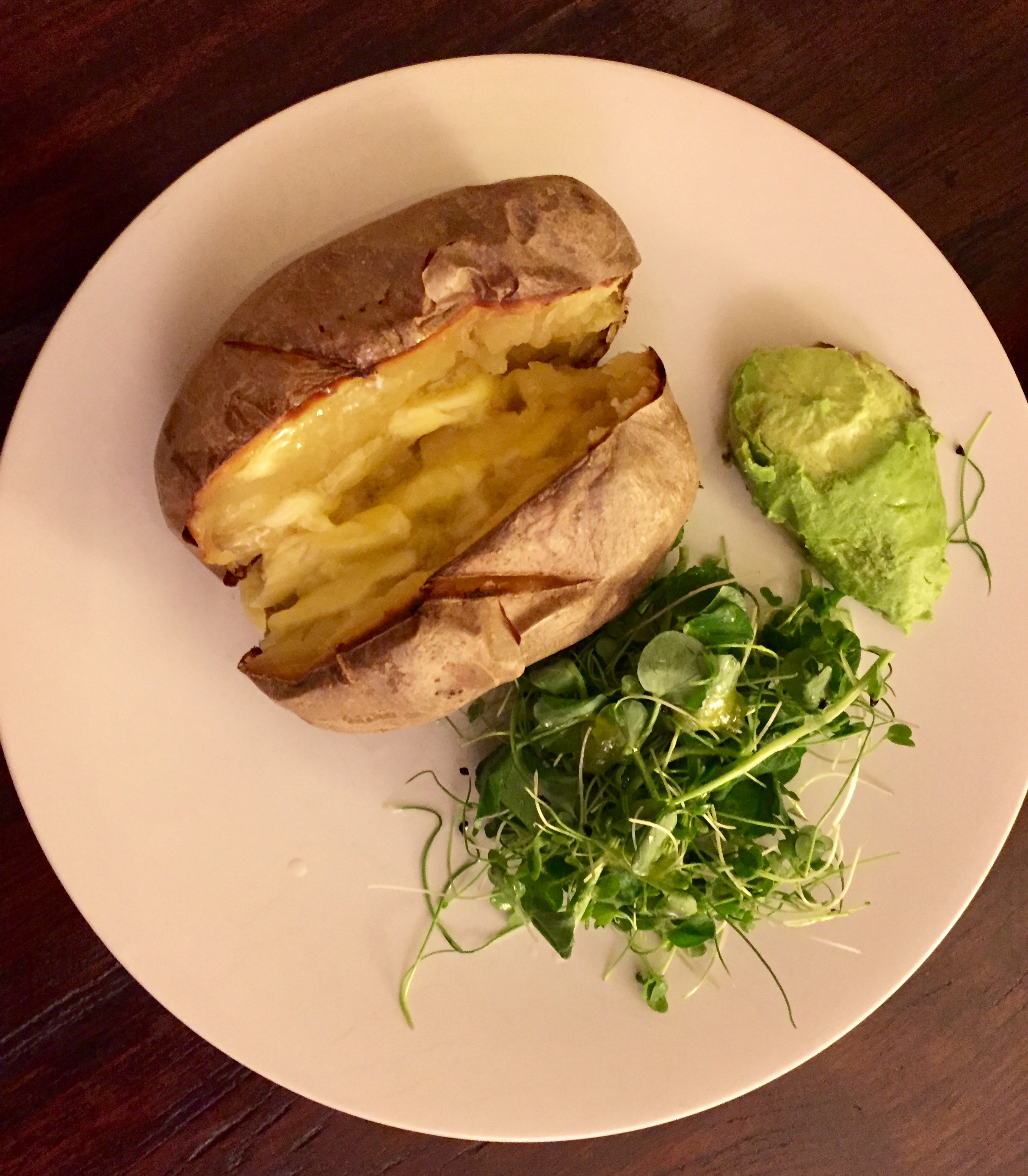 Simply bake the potatoes in a 180 degrees oven for an hour, no need for foil, serve with your favourite green, lemon & olive oil dressing, Avocados. How quick and simple is that!! x