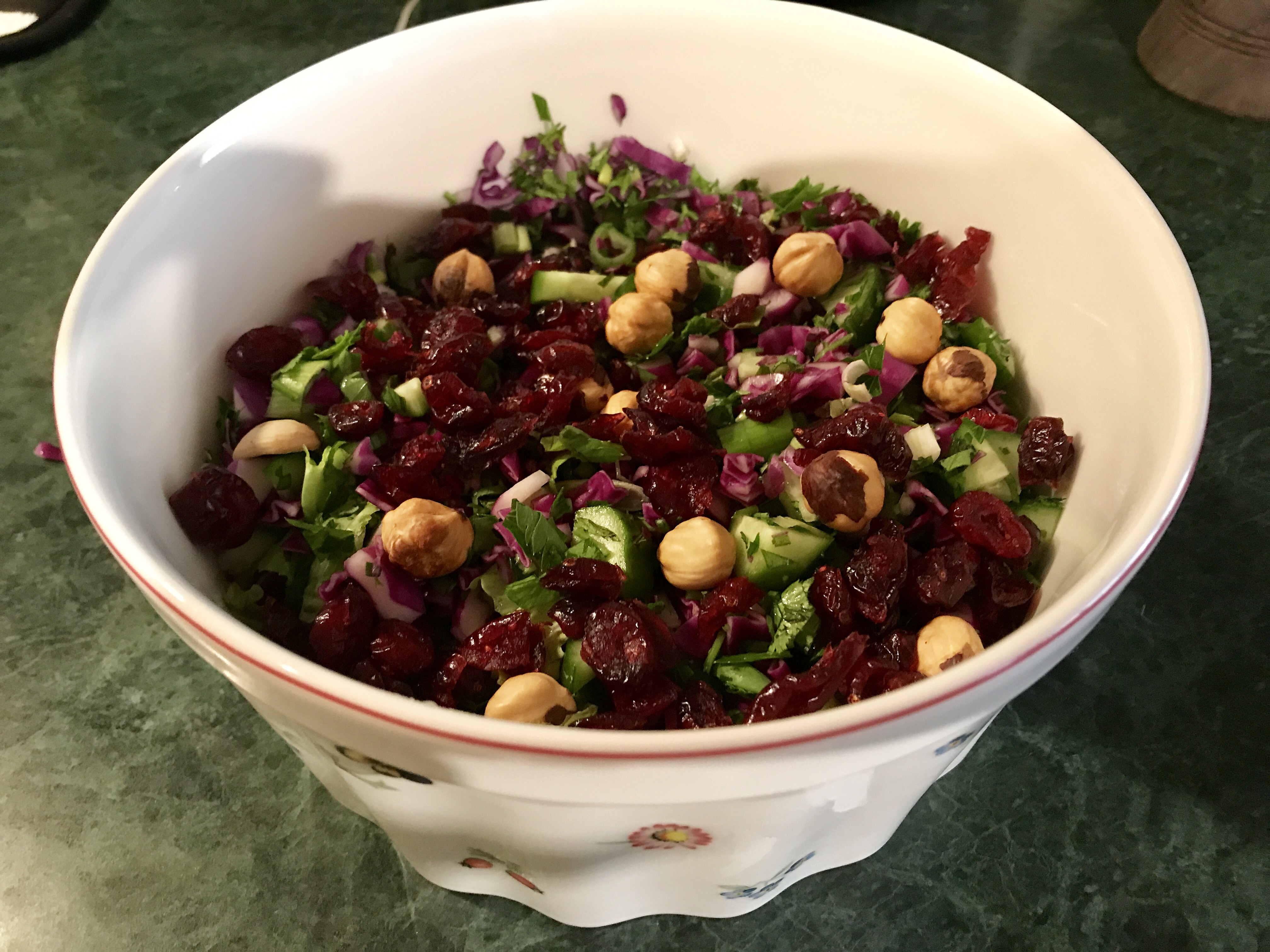 Looking for a bone loving, scrumptious salad, then look no further than my Red Cabbage, Cucumber, green Herbs, cranberries and Hazel nut salad. However if you suffer from Hypothyroidism or Hashimoto’s, then you should be avoiding goiters found in raw cruciferous vegetables such as the red cabbage. Otherwise this is a combination of herbs, and nuts that are loaded with minerals that helps regulate your hormones, and support your bone health, the added hazel nuts contain a mineral called Boron which is supportive of bone health, also nuts are considered proteins so this salad has all the Macro Nutrients you need for a summer lunch or an Iftar meal.